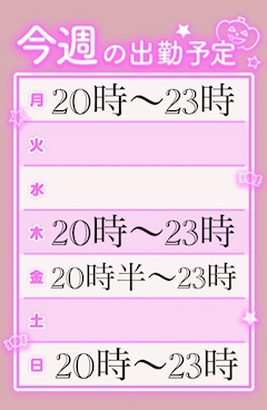 こんばんは🌙 今週の出勤予定です🗓️ EDGEとDollsを行き来しているため、 ご来店の際はお手数ですが、 お問い合わせくださいm(_ _)m その他の日で出勤希望日や 何かご不明点がございましたら、 わたし個人のLINEか インスタのDMから ご相談いただければ 予定調整等いたしますので よろしくお願いいたしますm(_ _)m 本日も23時まで 出勤しておりますので、 みなさまのご来店、 心よりお待ちしております🤖💙 名古屋のお土産も 貰いに来てくださいね〜👍🏻