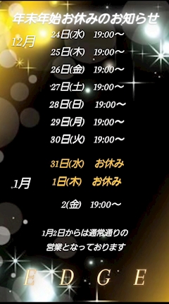 お疲れ様です😆🎵🎵 りおな🖤EDGE三宮🖤です 皆様に年末年始のお休みのお知らせです🍀😌🍀 12/31 (水) 1/1(木)はお店をお休みさせて頂きますが、 それ以外はあいております!! 年末年始もぜひ宜しくお願いします♥️