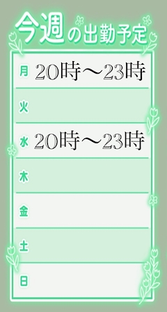 こんにちは🤖💚 今週の出勤予定です🗓️ EDGEとDollsを行き来しているため、 ご来店の際はお手数ですが、 お問い合わせくださいm(_ _)m その他の日で出勤希望日や 何かご不明点がございましたら、 わたし個人のLINEか インスタのDMから ご相談いただければ 予定調整等いたしますので よろしくお願いいたしますm(_ _)m わたしは本日20時〜、 EDGEにおります🪩 みなさまのご来店を 心よりお待ちしております🤲🏻 それではまた、ブログ 更新いたします🖊️✨